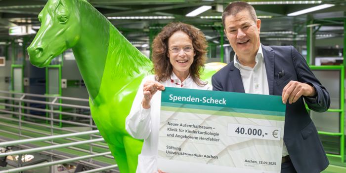 Mit einer Spende in Höhe von 40.000 Euro unterstützt die Stiftung Universitätsmedizin Aachen die kindgerechte Umgestaltung einiger Räumlichkeiten an der Klinik für Kinderkardiologie an der Uniklinik RWTH Aachen. Der Spendenscheck wurde von Univ.-Prof. Dr. med. Joachim Windolf, Vorsitzender der Stiftung, an Klinikdirektorin Univ.-Prof. Dr. med. Ulrike Herberg überreicht.