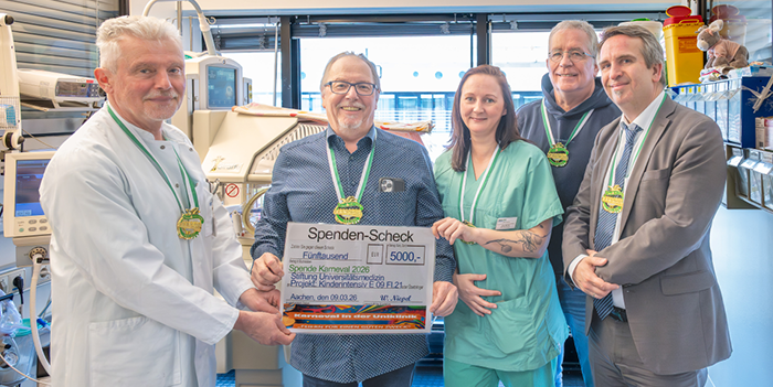 Auch in dieser Session haben sich die Karnevalsfreundinnen und -freunde wieder von ihrer großzügigen Seite gezeigt: Bei der jüngsten Karnevalsfeier der Uniklinik wurde für das Projekt „Eltern-Kind-Betreuung auf der Kinderintensivstation" der Stiftung Universitätsmedizin Aachen gesammelt. Dabei kam die beeindruckende Summe von 5.000 Euro zusammen.