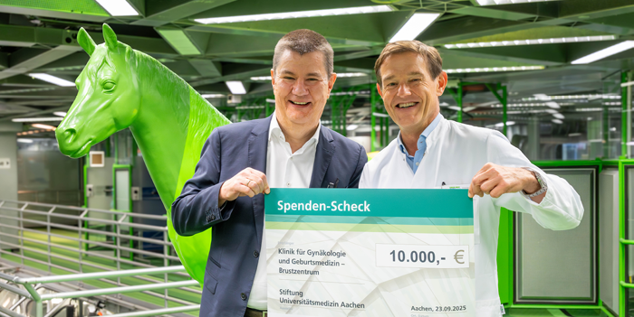Über eine Spende in Höhe von 10.000 Euro durfte sich die Klinik für Gynäkologie und Geburtsmedizin an der Uniklinik RWTH Aachen freuen. Univ.-Prof. Dr. med. Joachim Windolf, Vorsitzender der Stiftung Universitätsmedizin Aachen, überreichte den symbolischen Spendenscheck an Klinikdirektor Univ.-Prof. Dr. med. Elmar Stickeler.