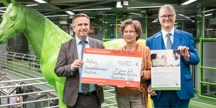 von rechts: Jochen Ahn, Leiter der Aachener Sparkassen-Geschäftsstelle Uniklinik, und seine Kollegin Alexandra Zietz übergeben den Spendenscheck an Florian Schaefer, Prokurist der Stiftung Universitätsmedizin Aachen.
